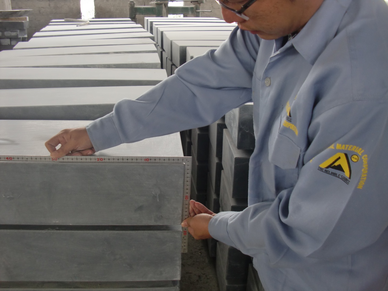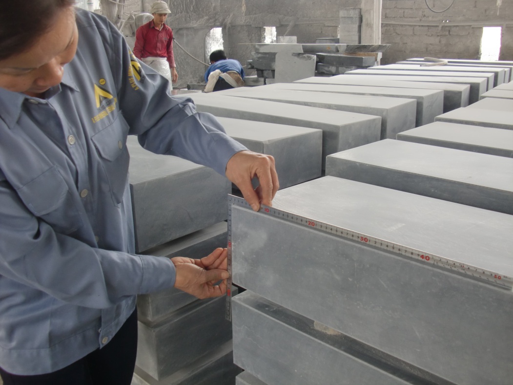 Following the aim of the course, we discussed about the current quality supervising process at factory and raised solutions for improvement. Each QC staff had to practice to use necessary tools for determining defects on products. Some regular defects on blue stone products are big tolerance in angles and dimensions, broken edges, black veins on the scraped surfaces, etc.